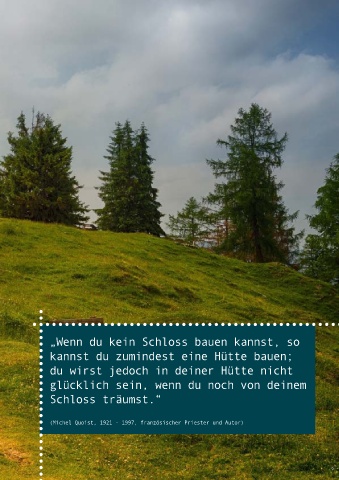 „Wenn du kein Schloss bauen kannst, so kannst du zumindest eine Hütte bauen; du wirst jedoch in deiner Hütte nicht glücklich sein, wenn du noch von deinem Schloss träumst.“ (Michel Quoist, 1921 - 1997, französischer Priester und Autor) 9